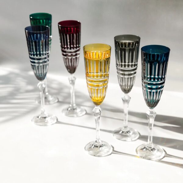 Le cristal coloré, taillé à la main, révèle des jeux de lumière qui subliment chaque bulle de champagne.