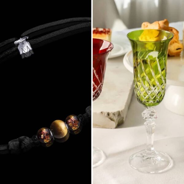 Cette sulfure en cristal, réalisé à la main et ornée de feuilles d’or et d’argent, incarne cette dualité précieuse.