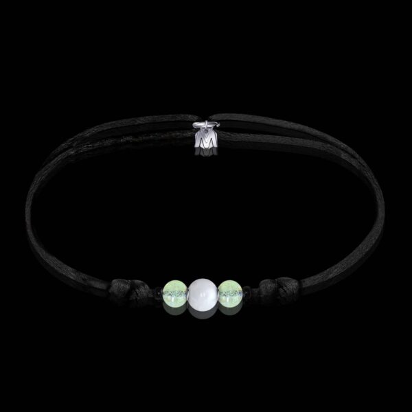 Notre bracelet aigue-marine se pare d’une aigue-marine et de deux perles en verre phosphorescentes fabriquées par notre verrier à la flamme en Lorraine.