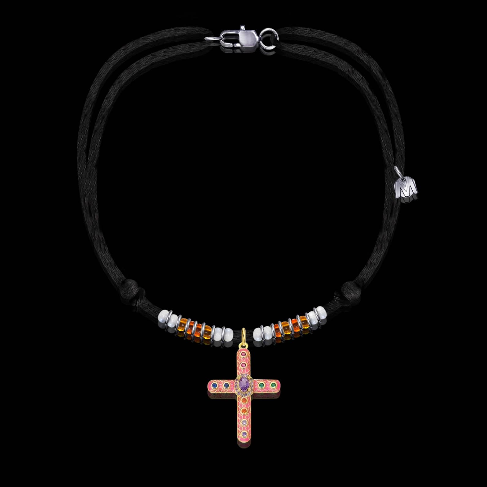 Ce collier met en avant une croix antique en émail, rehaussée de perles de Murano multicolores, suspendue à un cordon noir délicat et agréable à porter.