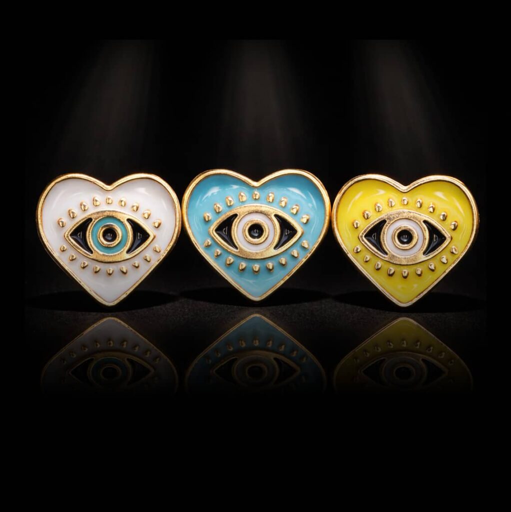 Ses couleurs vibrantes rencontrent la douceur d’un regard tendre. Les motifs en forme d’œil, traditionnellement connus pour leur pouvoir protecteur, s’entremêlent ici avec la symbolique du cœur.