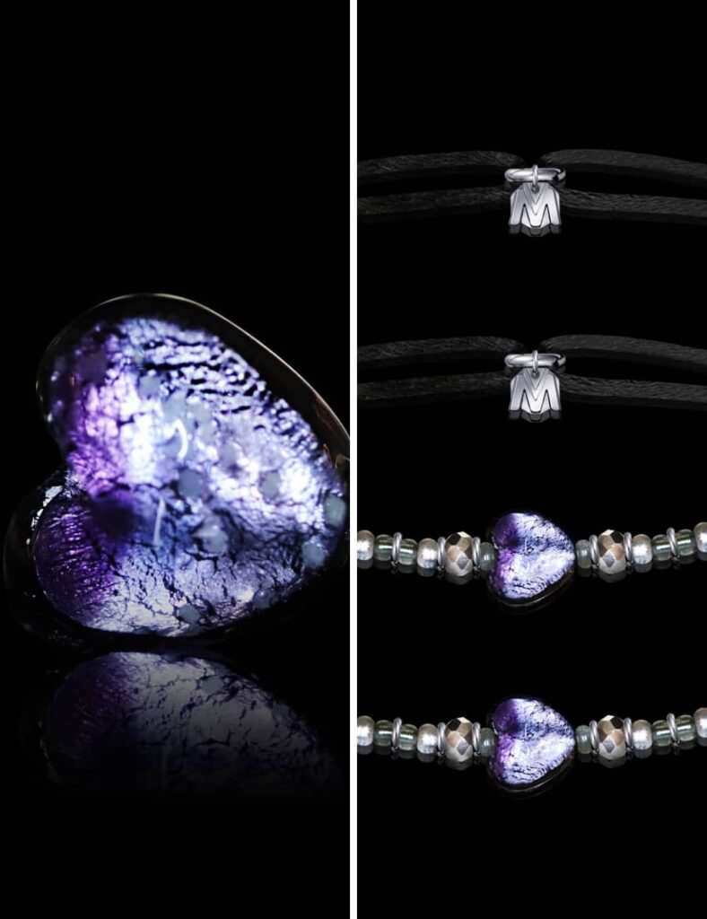 Nos bracelets cordon, véritables vitrines de l’art verrier, sont réglables sur tous poignets.